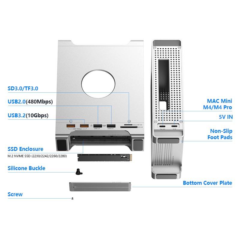 Elevate your Mac Mini M4 or M4 Pro setup with the all-in-one Blueendless MAC905 Docking Station. This premium aluminum stand not only improves workspace ergonomics but also unlocks powerful expansion capabilities with ultra-fast USB ports, dual card readers, and an integrated NVMe SSD enclosure — all through a single Type-C connection.