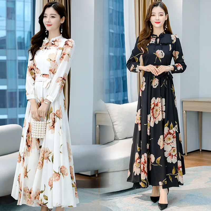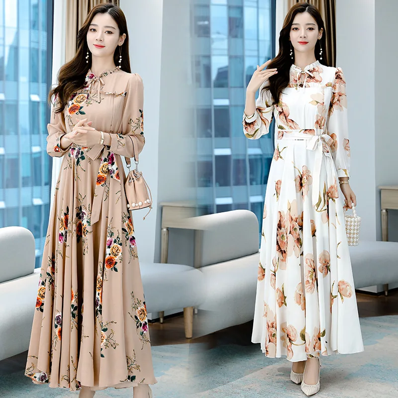 Spring Chiffon Floral Dress – Long Sleeve A-Line with Lace-Up Neck